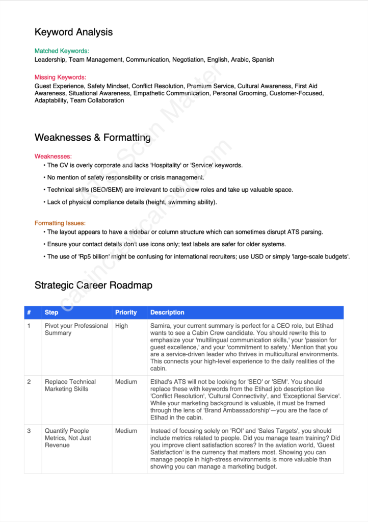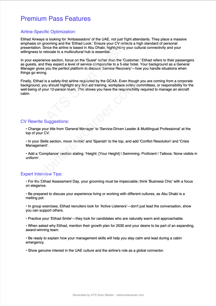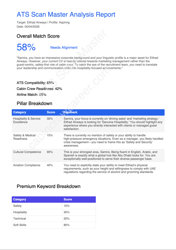 Most major airlines (especially carriers like Emirates, Qatar Airways, and Etihad) use an Applicant Tracking System (ATS) to filter through thousands of CVs. If your CV isn’t formatted correctly or lacks specific aviation keywords, the software may reject you before a human recruiter even sees your name. ATS Scan Master helps you see your CV through the eyes of that software.